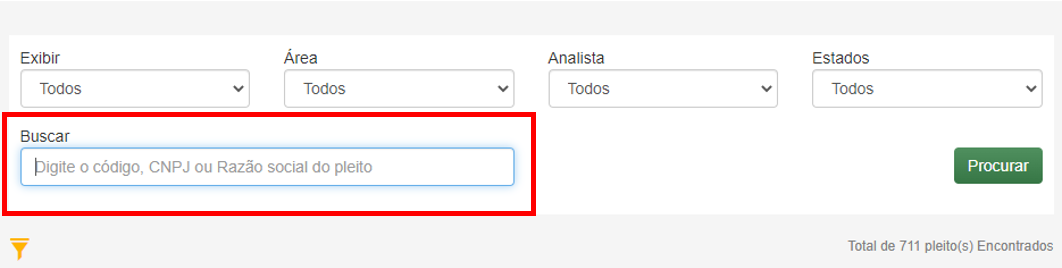 - No filtro 'Buscar', você informa o código, CNJP ou Razão social do pleito para realizar a pesquisa do mesmo.