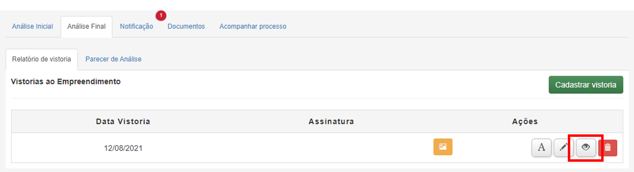 Ao abriar o pleito, será preciso clicar na Aba Análise Final, e logo em seguida na Aba Relatório de Vistoria, onde será mostrado o layout deste módulo como na imagem abaixo.